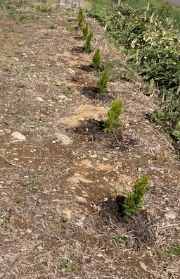 ツグミノ森の庭は、ほぼ手つかずの状態です。その為、昨年の夏~秋は草取りに苦労しました(汗)春になり、ちょっとずつ庭を整備していこうと計画をたてているところで、とりあえず南側にコニファーを植えてもらいました。